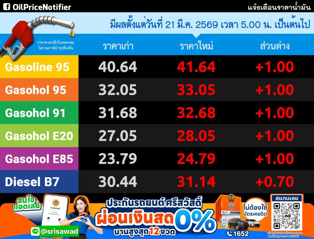 PTT Station ปรับราคาขายปลีกน้ำมันกลุ่มดีเซล เพิ่มขึ้น 0.70 บาท กลุ่มเบนซินและแก๊สโซฮอล์ เพิ่มขึ้น 1.00 บาท มีผล 21 มี.ค. 2569 เวลา 05.00 น.เป็นต้นไป