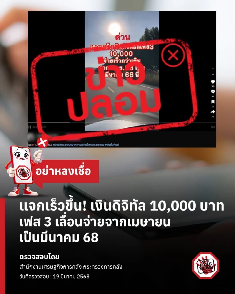 ล่าสุด ศูนย์ต้านข่าวปลอม โพสต์ข้อความว่า แชร์ไป เตือนภัยคนใกล้ตัว แจกเร็วขึ้น! เงินดิจิทัล 10,000 บาท เฟส 3 เลื่อนจ่ายจากเมษายนเป็นมีนาคม 68