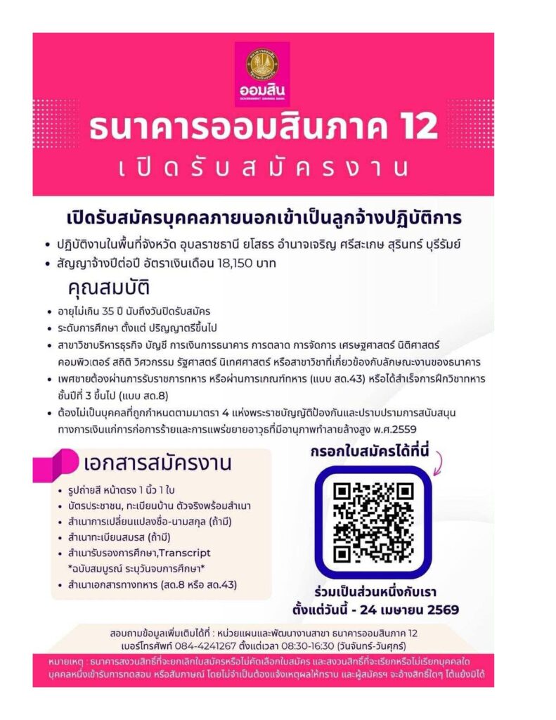 รับสมัครโดยกรอกใบสมัครงานได้ที่ https://jobs.gsb.or.th/ ตั้งแต่บัดนี้ – 24 เมษายน 2569