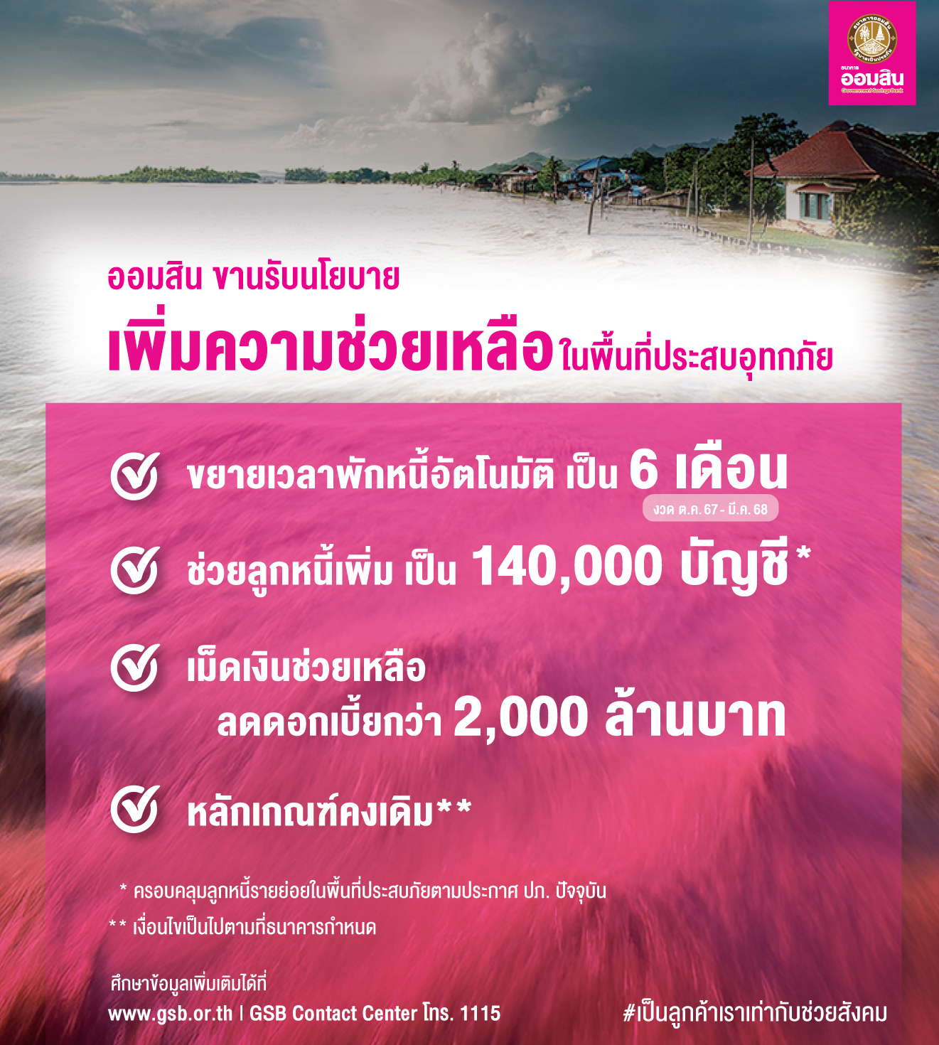 ออมสิน ช่วยลูกหนี้รับมือน้ำท่วมซ้ำ ขยายเวลาพักหนี้จาก 3 เดือน เป็น 6 เดือน