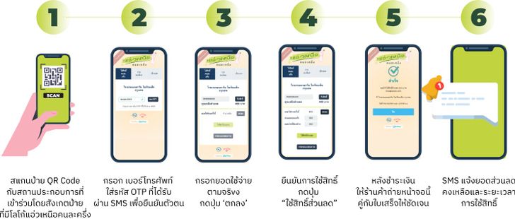 - ใช้สิทธิ์ ไปใช้สิทธิ์ส่วนลดโดยสแกน QR Code กับสถานประกอบการที่เข้าร่วมแคมเปญ