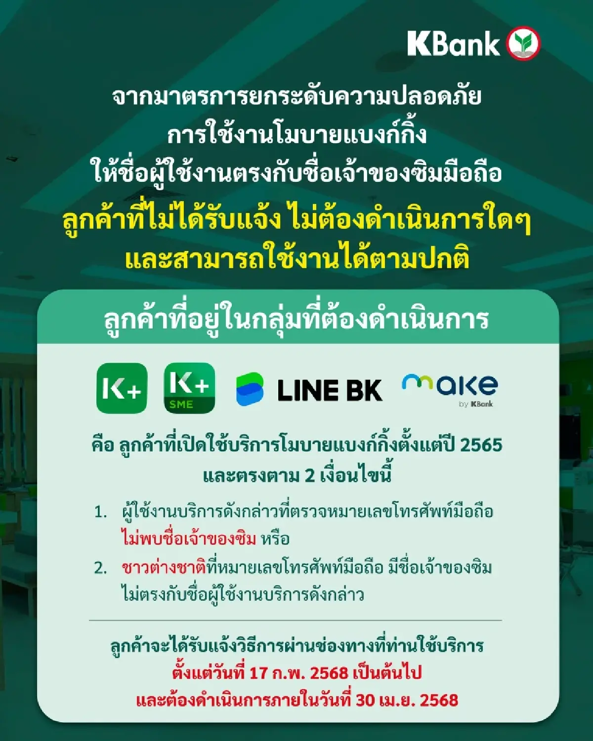 - ลูกค้าที่อยู่ในกลุ่มที่ต้องดำเนินการที่ใช้บริการ K PLUS / K PLUS SME/ LINE BK / MAKE by KBank จะได้รับแจ้งวิธีการผ่านช่องทางที่ท่านใช้บริการ ตั้งแต่วันที่ 17 กุมภาพันธ์ เป็นต้นไปและต้องดำเนินการภายในวันที่ 30 เม.ย. 2568