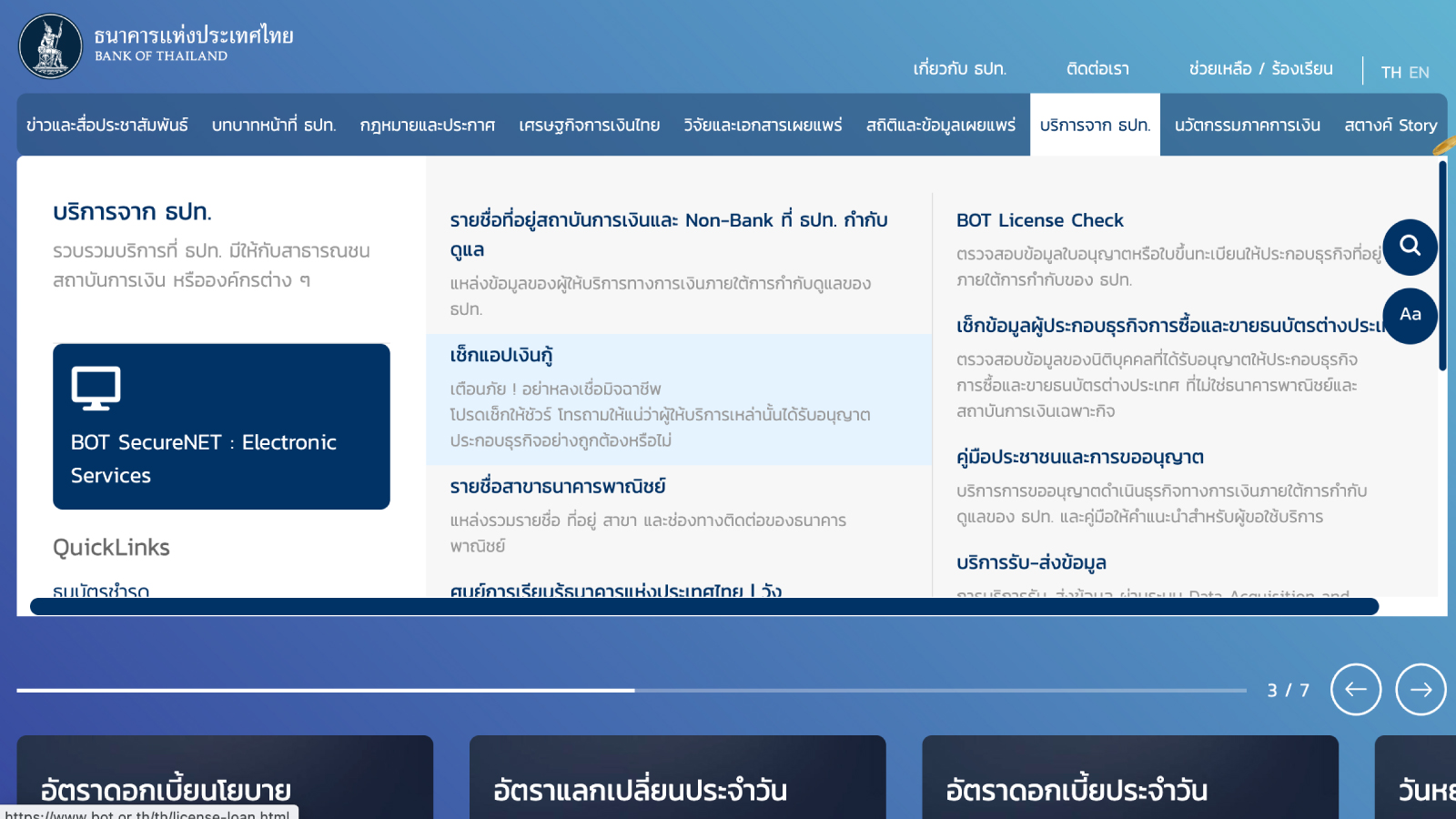อย่างแรกเลยก็คือจะต้องมีใบอนุญาตจากกระทรวงการคลัง ที่มีธนาคารแห่งประเทศไทยกำกับดูแล เป็นวิธีเช็คที่ง่ายที่สุดและหาข้อมูลได้ครบถ้วน โดยให้เข้าไปที่ “เช็กแอปเงินกู้” ของเว็บธนาคารแห่งประเทศไทย จากนั้นก็ใส่ชื่อแอพที่อยากรู้เข้าไปในช่องค้นหา จากนั้นเลือกว่าเป็นของธนาคารเอง หรือ Non-Bank ก็จะเช็คข้อมูลแอพได้ง่ายๆ แล้วว่าถูกกฎหมายหรือไม่