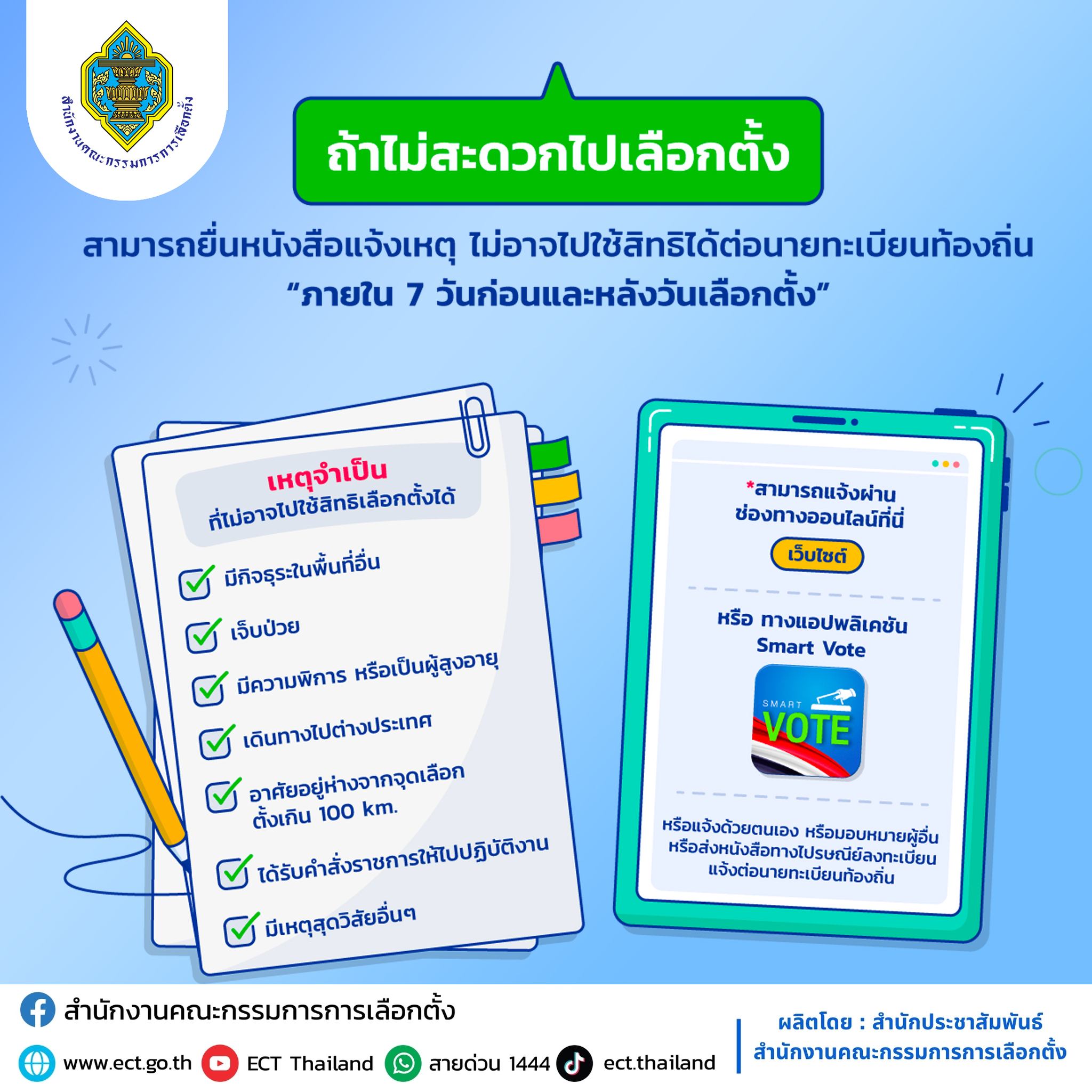 หมายเหตุ: กรณีที่แจ้งเหตุไว้แล้ว หากในวันเลือกตั้งเหตุดังกล่าวสิ้นสุดลง ผู้มีสิทธิเลือกตั้งยังสามารถไปใช้สิทธิที่หน่วยเลือกตั้งได้ตามปกติ