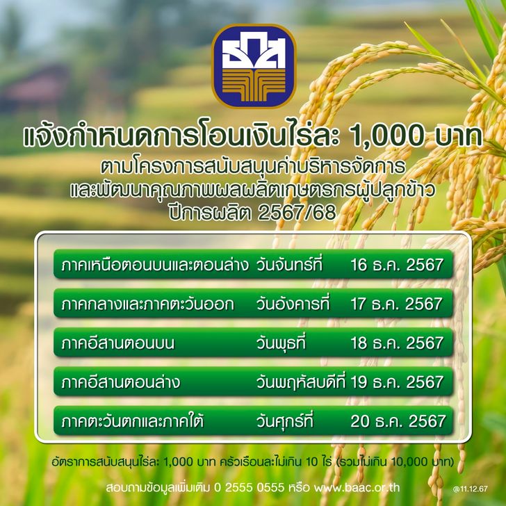 - รอบที่ 2 ภาคกลางและภาคตะวันออก โอนจ่ายวันที่ 17 ธันวาคม 2567