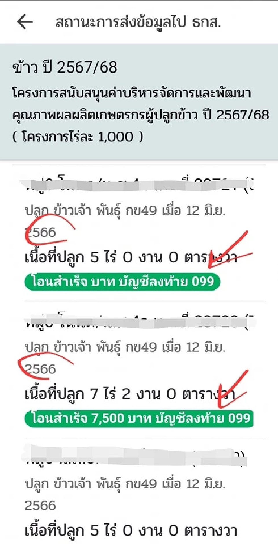 บางคนถ้ายังส่งแปลงไม่ครบเป็นไปได้ว่าเงินจะเข้าไม่พร้อมกัน ส่วนระบบในแอพฟาร์มบุ๊ค เกษตรเข้าไปเช็คยังไม่ขึ้นข้อมูลปี 67/68 มีของปีก่อนแต่แสดงเลขท้ายบัญชีด้วย (ของปีก่อน) คงต้องรอระบบไปก่อน