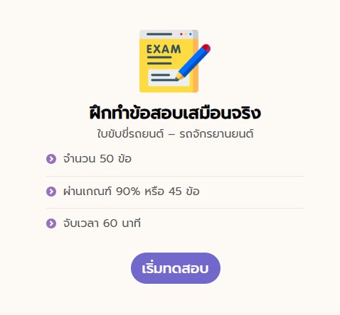 เตรียมความพร้อมสอบใบขับขี่ เว็บฝึกทำข้อสอบ เป็นเว็บที่จัดทำโดยสำนักงานขนส่งโดยตรง ไว้ให้เราฝึกทำทั้งหมด 50 ข้อ พร้อมจับเวลาเหมือนสอบจริง