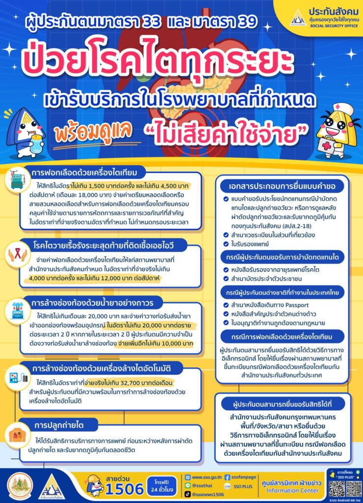 สำนักงานประกันสังคมย้ำสิทธิผู้ประกันตนมาตรา 33 และมาตรา 39 หากป่วยโรคไต สามารถเข้ารับการรักษาในสถานพยาบาลที่กำหนด โดยไม่เสียค่าใช้จ่าย