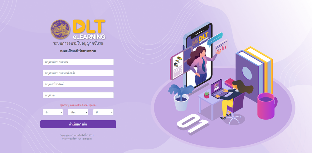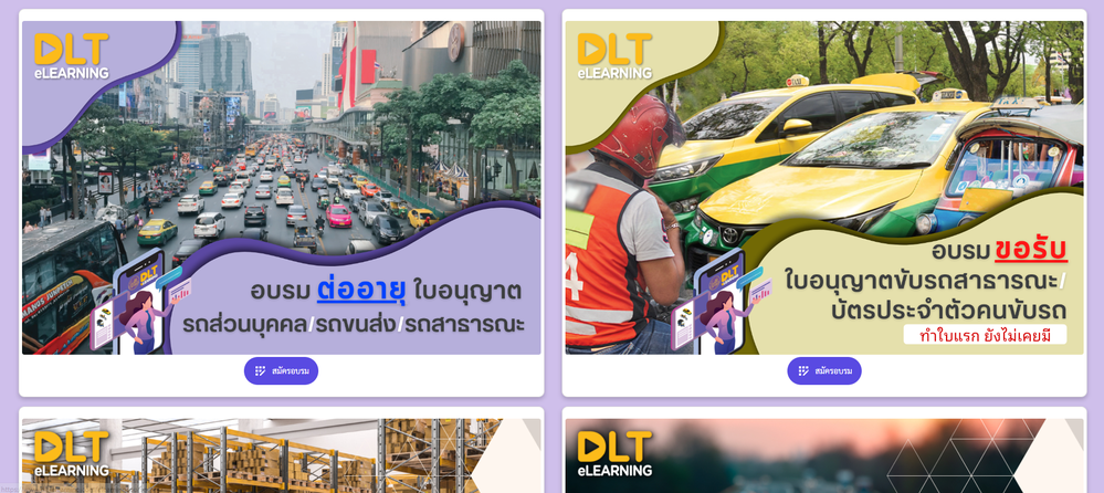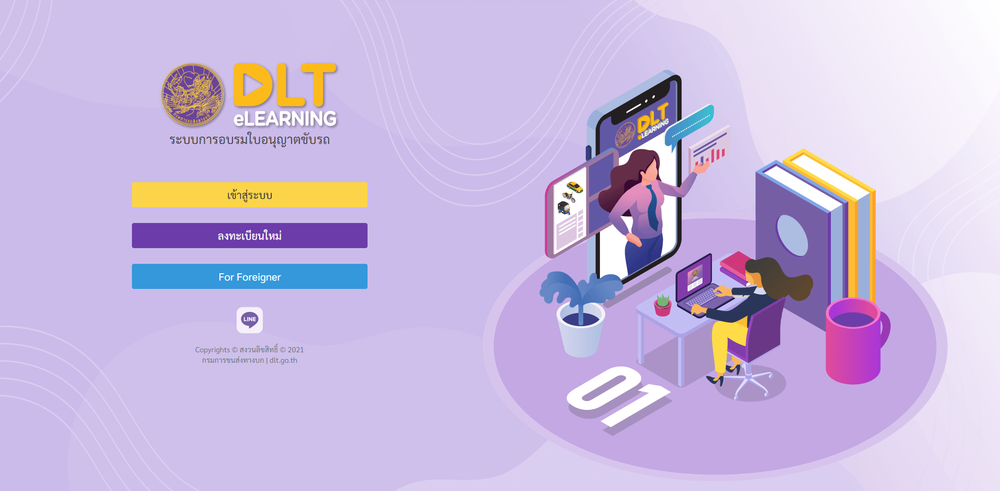 อบรมผ่านระบบ e-learning ใบขับขี่ ให้คุณเข้าไปที่ www.dlt-elearning.com ซึ่งจะมีปุ่มให้คุณเลือก ได้แก่ เข้าสู่ระบบ ลงทะเบียนใหม่ และ For Foreigner สำหรับชาวต่างชาติ