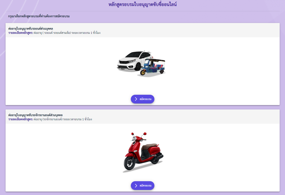 - [ต่ออายุ] ใบอนุญาตขับรถส่วนบุคคล ขาดต่ออายุเกิน 1 ปีขึ้นไป (รถจักรยานยนต์ รถยนต์สามล้อ รถยนต์) อบรมต่อใบขับขี่ออนไลน์ 2 ชั่วโมง