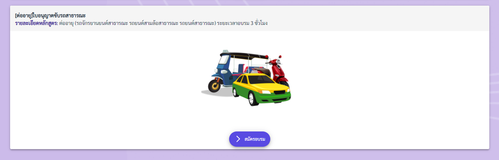 - [ต่ออายุ] ใบอนุญาตขับรถสาธารณะ (รถจักรยานยนต์สาธารณะ รถยนต์สามล้อสาธารณะ รถยนต์สาธารณะ) อบรมออนไลน์ต่อใบขับขี่ 3 ชั่วโมง