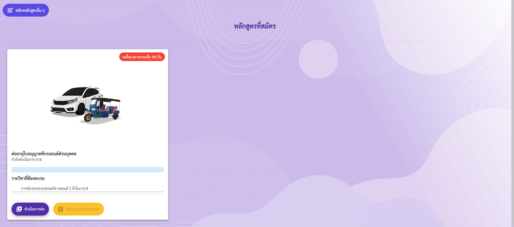 หน้านี้จะขึ้นหลักสูตรที่สมัคร ถ้าพร้อมอบรมให้เรากด “ดำเนินการต่อ” แค่นี้ก็เรียบร้อย ฟังอบรบที่ไหนก็ได้ สะดวกสุดๆ ต่ออายุใบขับขี่ออนไลน์ ง่าย ๆ แค่นี้เอง